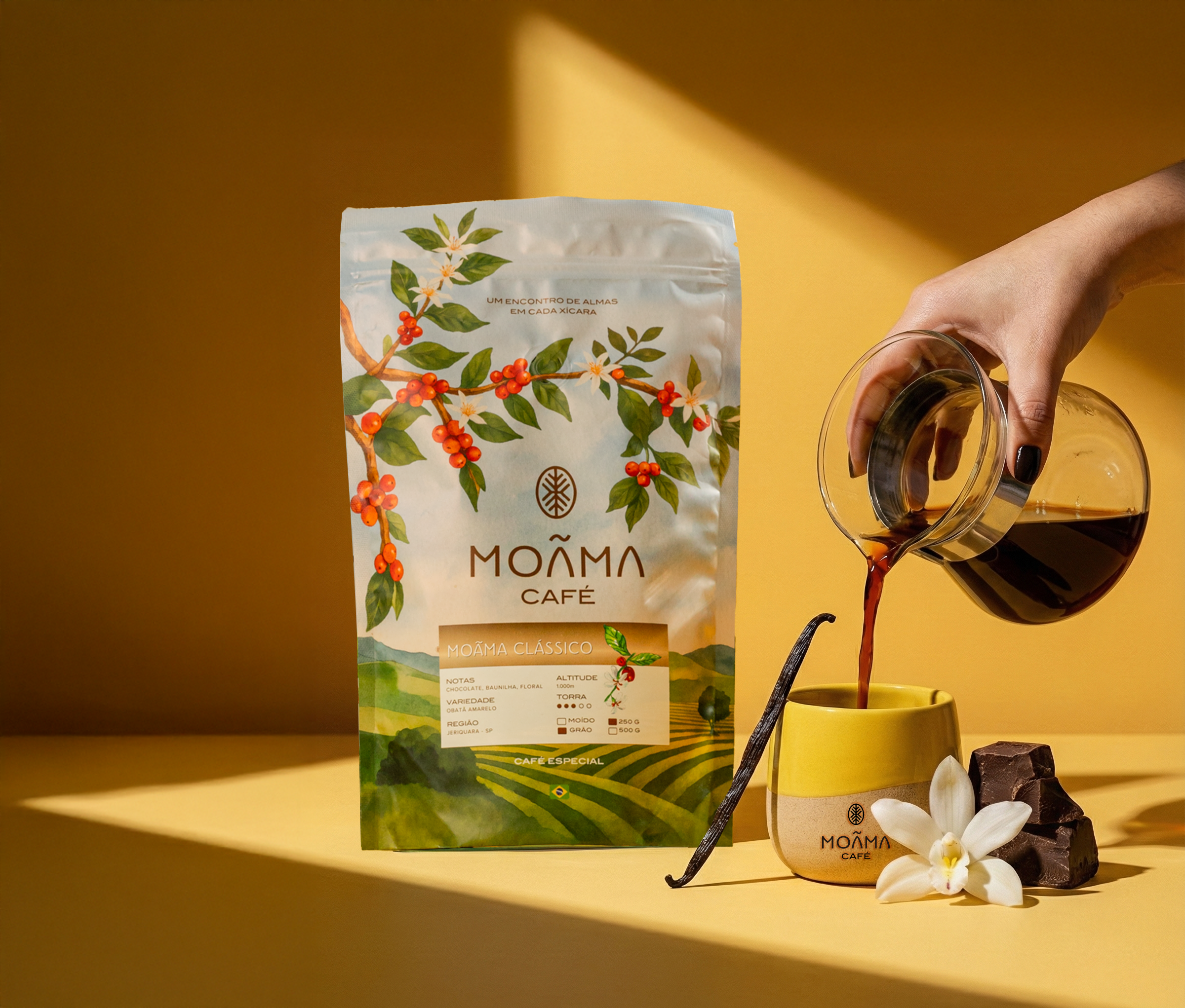 Com notas de chocolate e baunilha, o Moãma Clássico entrega uma xícara aconchegante, com corpo médio, acidez suave e finalização limpa.